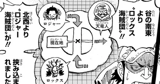 - 谷の南東からロックス海賊団、北西からロジャー海賊団