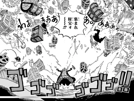 シャンクスを抱えて走るドラゴンも銃が磁気に引っ張られシャンクスを見失う。そしてシャンクスは財宝のキラキラに夢中になり宝箱へ。