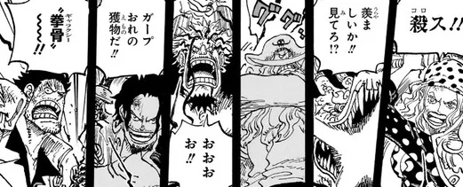 そして戦闘が始まると見ていた海兵は援護をするべきかと戸惑い、割って入るガープは海兵を下がらせ「援護に決まってる」と悪い顔をするのでした。