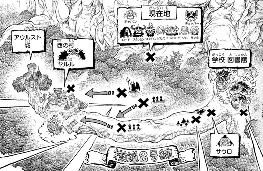 | ”黒転支配”巨兵海賊団 | ドリー、ブロギー、他 | 「西の村」へ進行中 「ヤルルを殺せェ‼︎!」 |